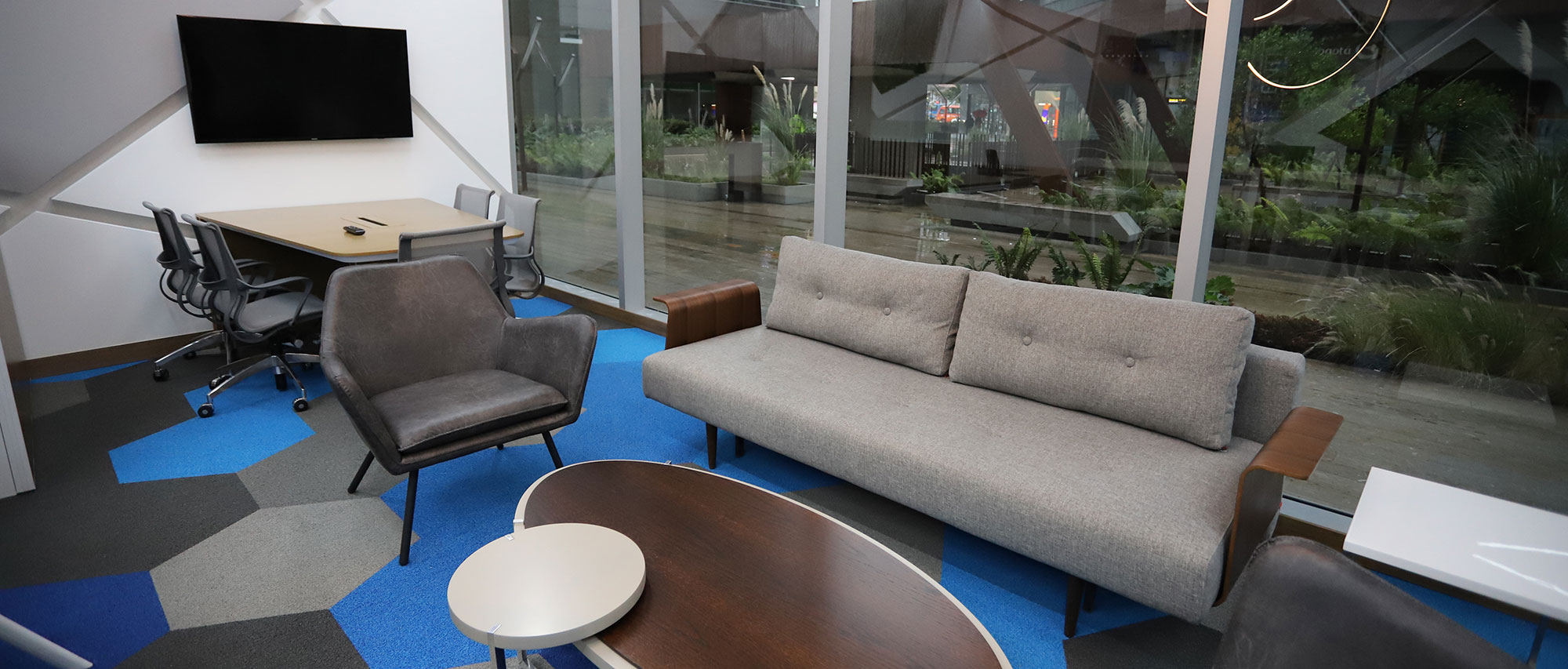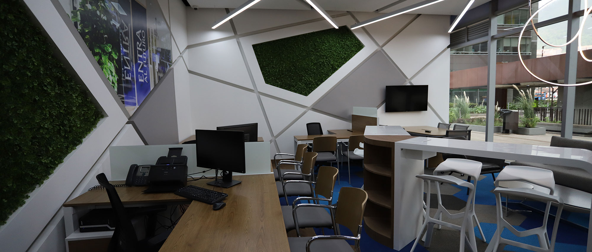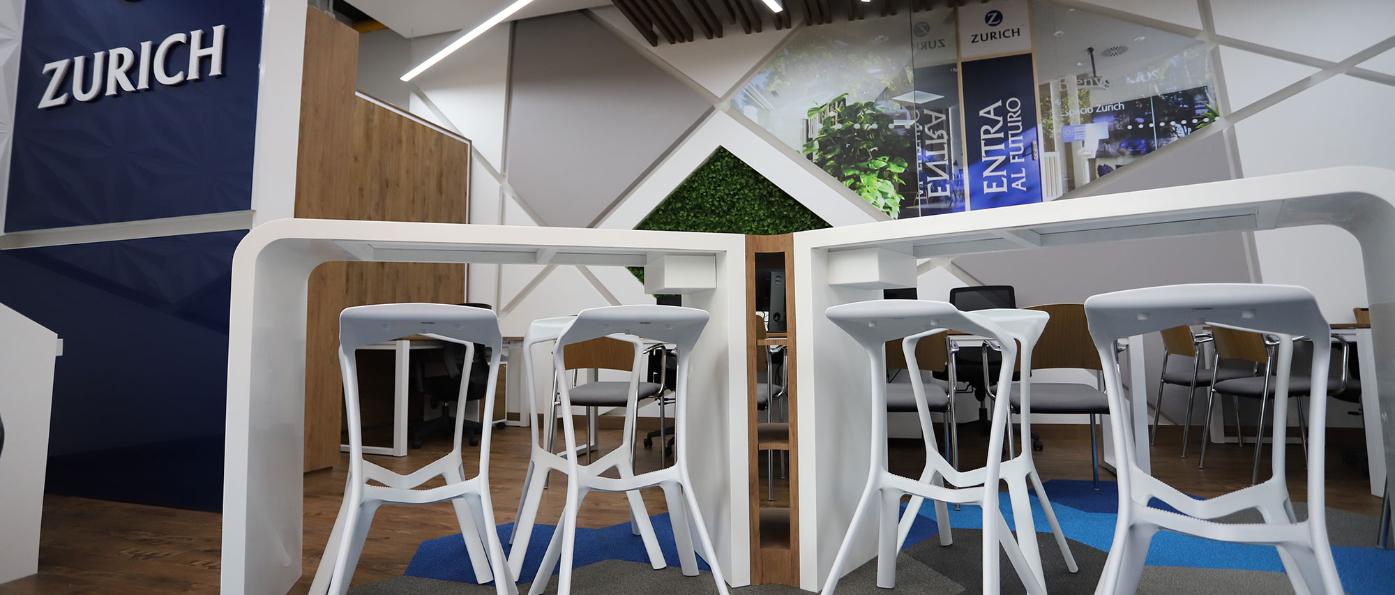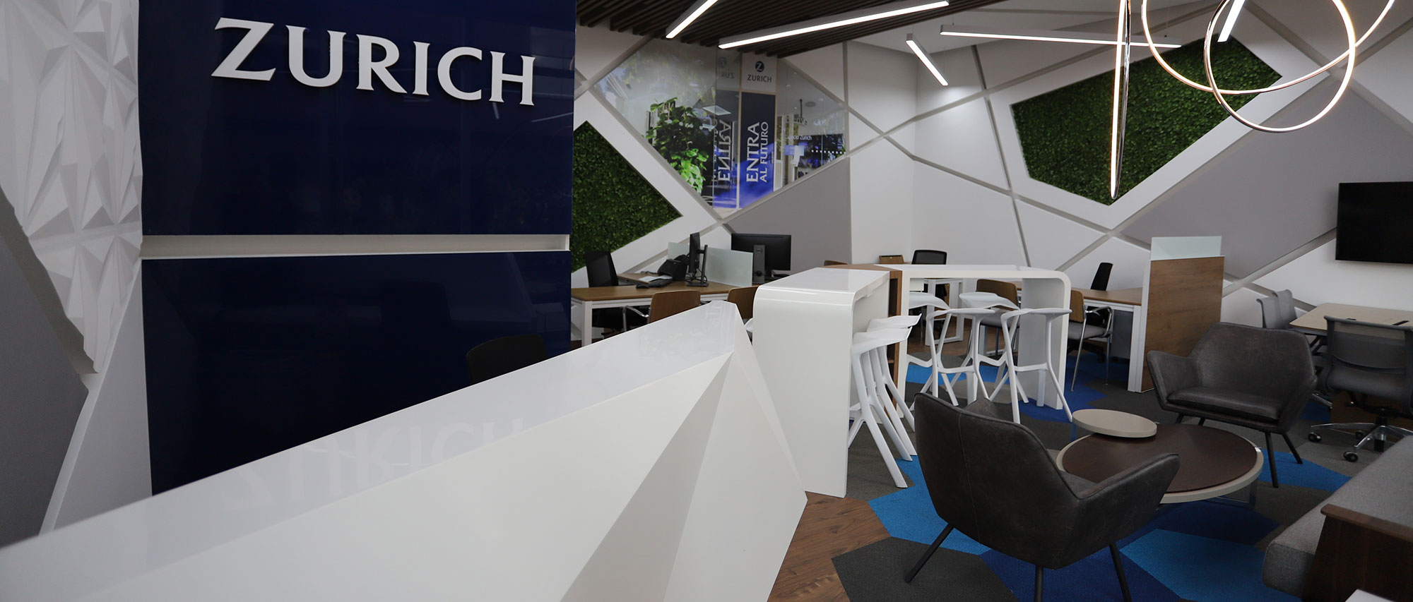 El diseño inspirado en las geometrías de elementos que hacen parte del mobiliario urbano de la plazoleta aledaña, para así mantener un aspecto familiar y se mantenga como una sola unidad, respetando la imagen corporativa y lineamientos que en términos de colores y estética la compañía (ZURICH) exige a nivel mundial de acuerdo a su regulación.